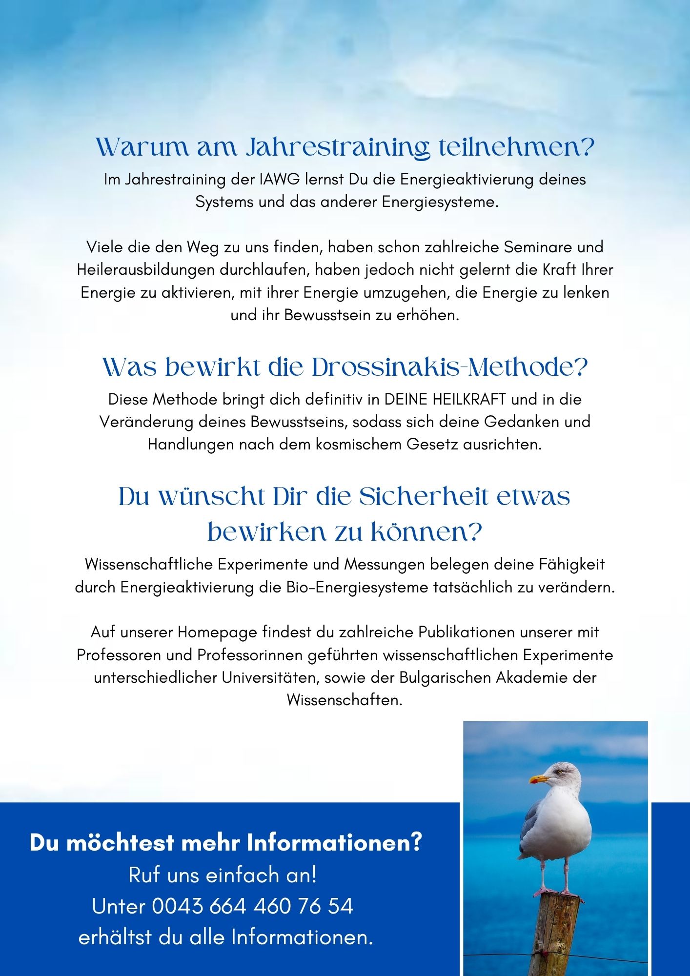Der Mensch ist Physik und erlernt im Laufe seines Lebens die Kunst mit seiner Energie umzugehen. Eine positive Lebenseinstellung verändert die innere Welt und aktiviert die Selbstheilungskräfte, die das biologische System zur optimalen Funktion und Heilung benötigt. Die Lehren und seine erfolgreiche Methode gibt Christos im Jahrestraining.